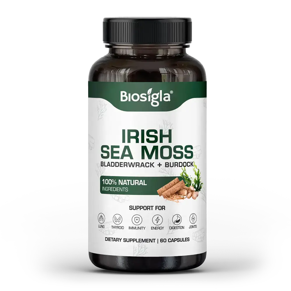 Biosigla – Irish Sea Moss - Kapsle pomáhají obnovit vaše plíce a posílit vitalitu. Tato silná směs obsahující irský mořský mech, mořskou řasu a kořen lopuchu rychle působí a: