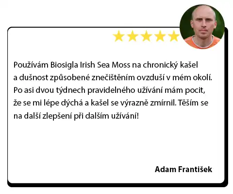 Používám Biosigla Irish Sea Moss na chronický kašel a dušnost způsobené znečištěním ovzduší v mém okolí. Po asi dvou týdnech pravidelného užívání mám pocit, že se mi daří dýchat hlouběji a kašel se výrazně snížil. Těším se na další zlepšení, jak budu přípravek používat dál!