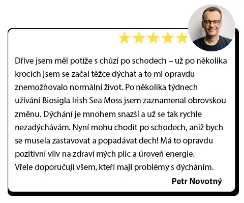 Dříve jsem měl potíže s chůzí po schodech – už po několika krocích jsem se začal těžce zadýchávat, což mi opravdu znepříjemňovalo každodenní život. Po několika týdnech užívání Biosigla Irish Sea Moss jsem zaznamenal obrovskou změnu. Dýchání je mnohem snazší a už se tak rychle nezadýchávám. Nyní mohu chodit po schodech, aniž bych se musela zastavovat a popadávat dech! Má to opravdu pozitivní vliv na zdraví mých plic a úroveň energie. Vřele doporučuji všem, kteří mají problémy s dýcháním.
