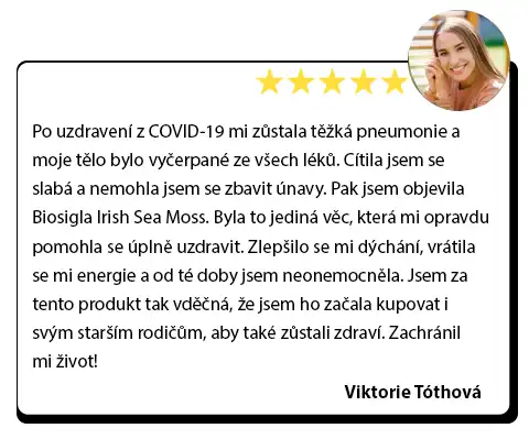Po uzdravení z COVID-19 mi zůstala těžká pneumonie a moje tělo bylo vyčerpané ze všech léků. Cítila jsem se slabá a nemohla jsem se vzchopit. Pak jsem objevila Biosigla Irish Sea Moss. Byla to jediná věc, která mi opravdu pomohla se úplně uzdravit. Zlepšilo se mi dýchání, vrátila se mi energie a od té doby jsem nebyla nemocná. Jsem za tento produkt tak vděčná, že jsem ho začala kupovat i svým starším rodičům, aby také zůstali zdraví. Zachránil mi život!
